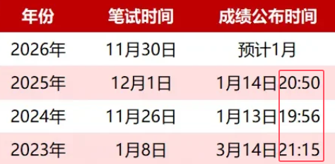 通过整理近几年国考笔试成绩发布时间,发现近几年国考成绩都是晚上开通入口。