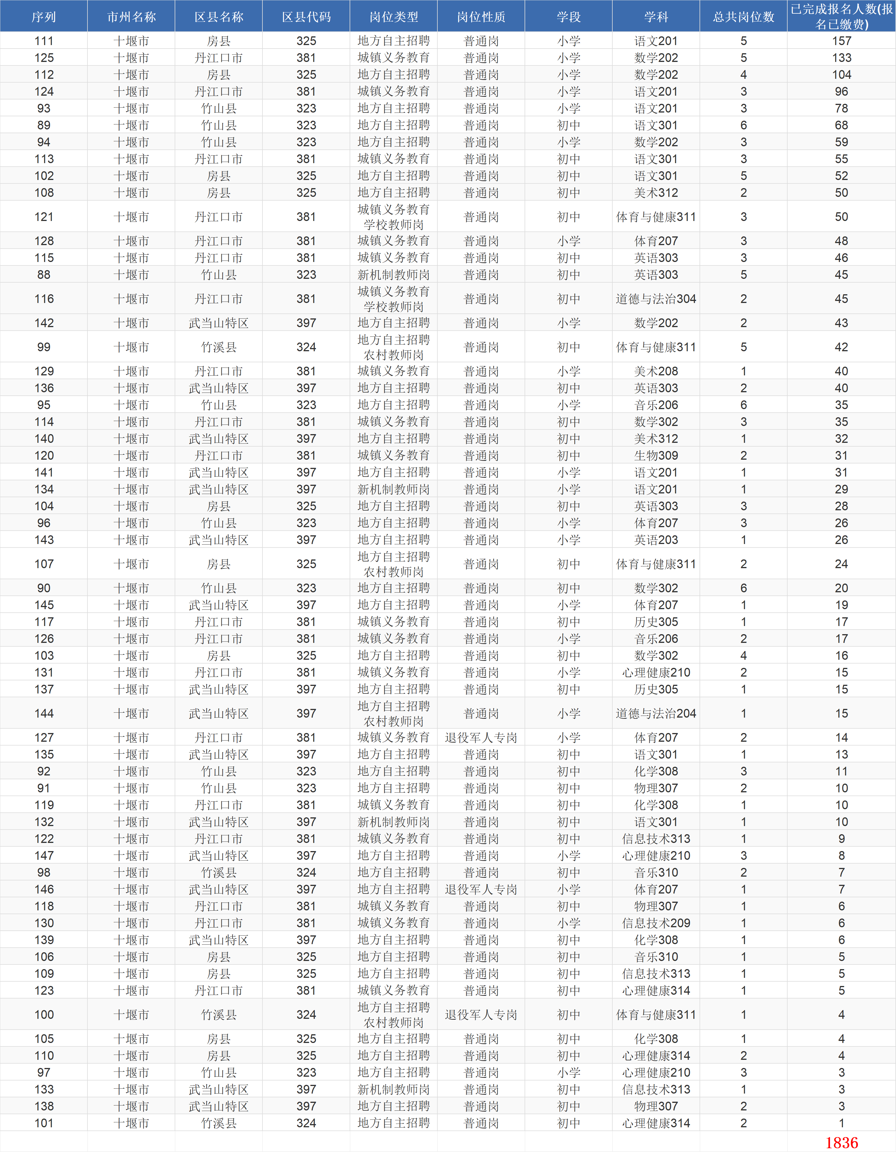 2026年湖北中小学教师招聘全省岗位各学段各学科报名情况(统计时间:2026/4/20 11:30,十堰已完成报名人数(报名已缴费)1836人,每小时更新一次,最后一次更新是报名截止前30分钟)
